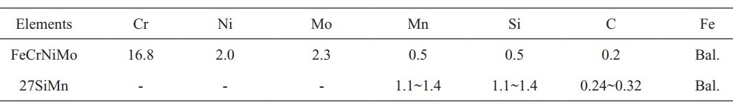 马氏体不锈钢具有较高的硬度, 与奥氏体不锈钢和双相不锈钢相比具有更好的耐磨性, 可满足磨损和腐蚀双重环境作用下的工况需求, 可用于煤矿液压支架、 海洋平台立柱等结构的表面防护和修复用涂层材料。为提高金属基体的耐磨、耐蚀综合性能, 目前国内普遍采用的工艺是电镀硬铬, 该方法虽然工艺简单、 成本低, 但镀层与基体结合强度较低, 易脱落, 且电镀工艺对环境污染严重, 近年来开发环境友好型的替代工艺已成为材料表面工程领域的重要研究方向。激光熔覆技术利用激光高能量密度的特点, 可在基体表面形成致密的冶金结合层, 被广泛用于提高金属表面硬度、 耐磨性、 耐蚀性和抗蠕变性能等。FeCrNiMo 马氏体不锈钢是在 AISI 431 不锈钢的基础上, 通过适当调整合金元素的含量获得的具有更高综合性能的马氏体不锈钢。采用激光熔覆工艺可将 FeCrNiMo 马氏体不锈钢粉末熔覆于高强结构钢(如 27SiMn) 基体表面, 制得具有良好的耐蚀、 耐磨综合性能的工件。然而, FeCrNiMo不锈钢的裂纹敏感性较高, 熔覆层与基体的热膨胀系数存在差异, 且激光熔覆工艺的冷速较高,在熔覆过程中极易产生较大的内应力, 因此在制备较大厚度(2 mm 以上) 的熔覆层时易产生裂纹缺陷。因此, 研究熔覆过程中的应力分布情况,有助于预测裂纹产生的倾向, 并优化调整相应的熔覆工艺, 以提高熔覆层质量。然而, 激光熔覆过程是高温下的动态加工过程, 采用实验方法难以准确获得实时的热、 力学参数, 而数值模拟方法可为此提供一种有效的分析手段。